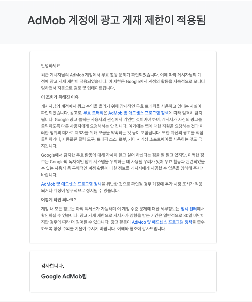 - 교훈: 초기 마케팅을 어느 정도 진행하여 초기 사용자를 확보해야 AdMob 정지 상황을 막을 수 있음. 사용자가 몇 명 없다면 AdMob은 더욱 엄격하게 체크하는 것으로 체감