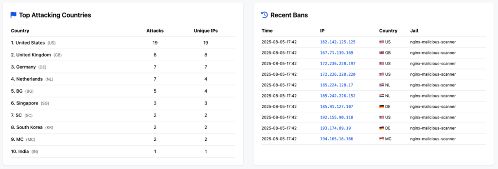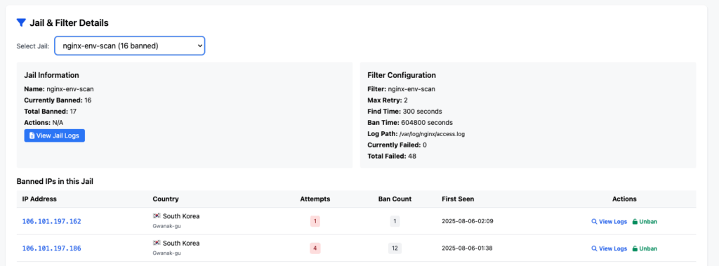 그래서 웹 대시보드에 unban 버튼을 만들었어요. 차단된 IP 목록에서 버튼 하나만 누르면 바로 해제! 특히 개발 환경에서 테스트할 때는 이 기능이 정말 생명줄이에요.